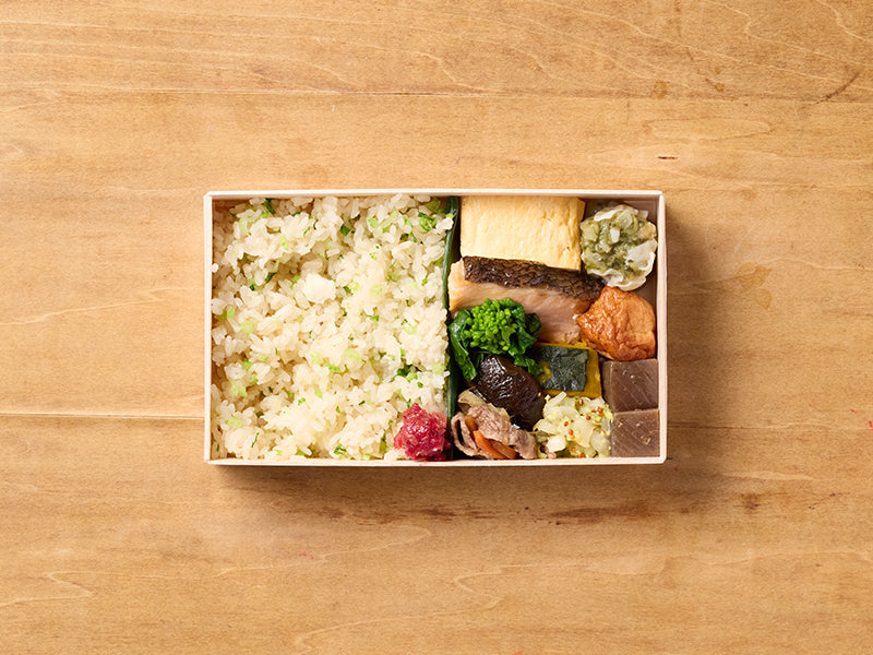 たっぷりとご飯を詰め、その上に「じゃこ山椒」と「季節の野菜ナムル」をのせました。「じゃこ山椒」は、国産のじゃこをふっくらと炊き、香高い実山椒を一緒に炊き上げました。