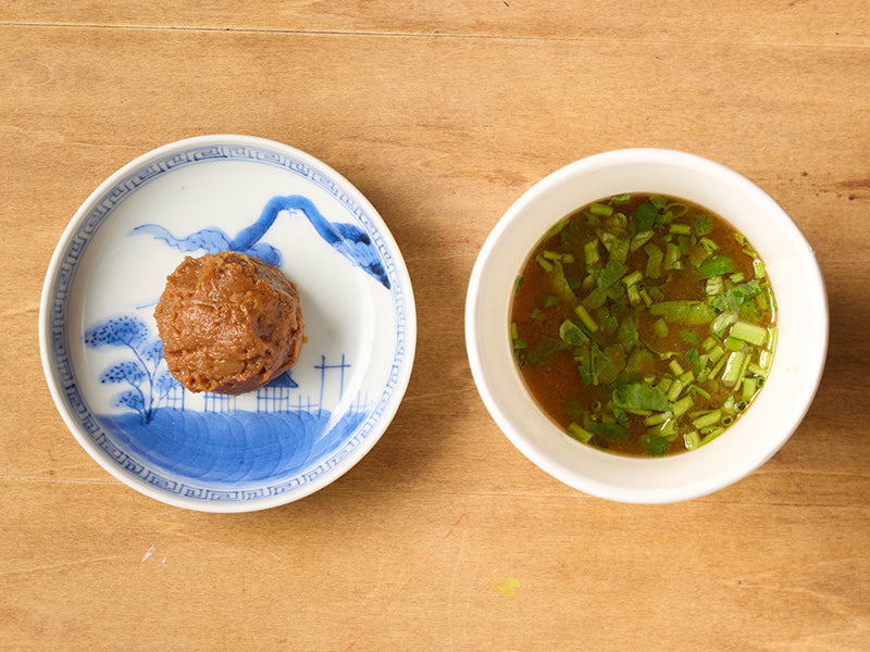 カップに、味噌玉を入れてお渡しします。お湯で溶くだけで、簡単なお味噌汁が出来上がり。